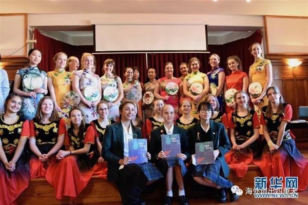 (10月17日,在新西兰首都惠灵顿,塞缪尔·马斯丹女校的师生展示新书《飞翔的奇异鸟——新西兰中小学生演讲集》。中英对照新书《飞翔的奇异鸟——新西兰中小学生演讲集》17日在塞缪尔·马斯丹女校举行新书发布会。此书的发布正值16日新西兰启动2017年中文周。新华社记者宿亮摄)
