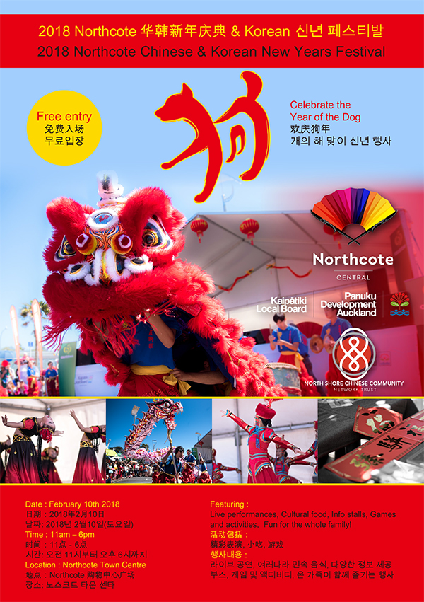 2018年2月10日,由Kaipatiki Local Board,Panuku Development Auckland以及Northshore Chinese Community联合主办Northcote华韩新年庆典将于Northcote Shopping Center举行。
