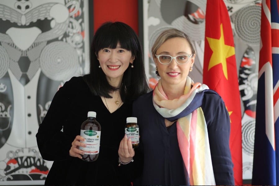 新西兰驻上海总领事葛甘楠女士(右)推荐汤普森的明星产品葡萄籽精华