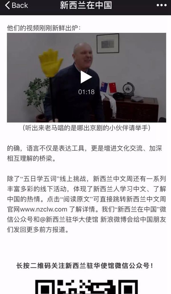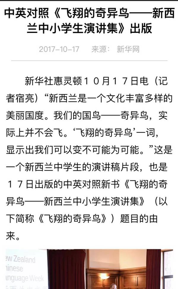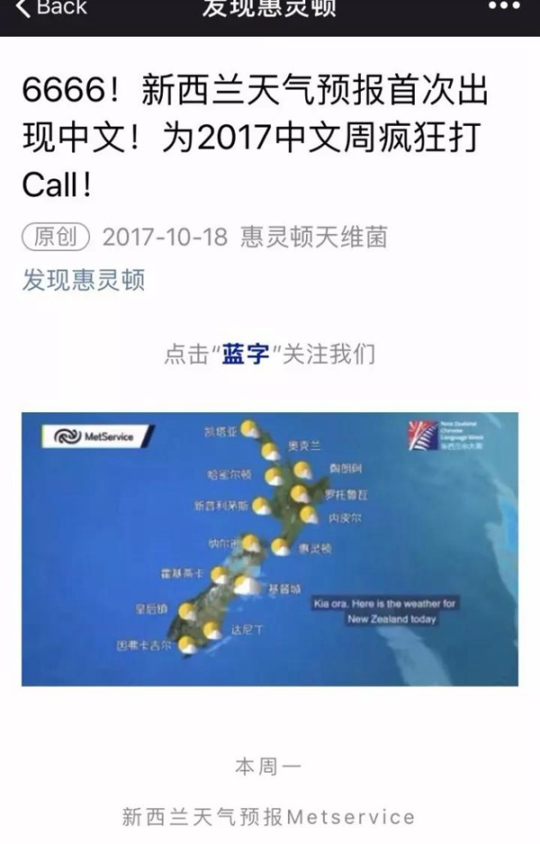 一年一度的新西兰中文周在主流媒体掀起一股中文热。史上第一次新西兰天气预报用中文标地名,中文周慈善信托和中国高教出版社联合出版《飞翔的奇异鸟 —— 新西兰中小学生演讲集》。2017年初中国总理李克强访问新西兰,表示以“中文周”方式推展中华文化和语言,在西方国家尚属第一!