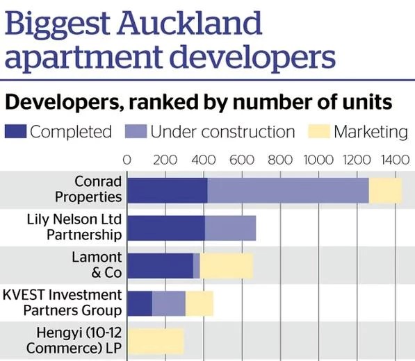 报告显示,奥克兰最大的开发商是Robert Holden的Conrad Properties。该公司已完工的、正在施工的以及上市销售的公寓数量都是最多的,比排名第二的多出近两倍。