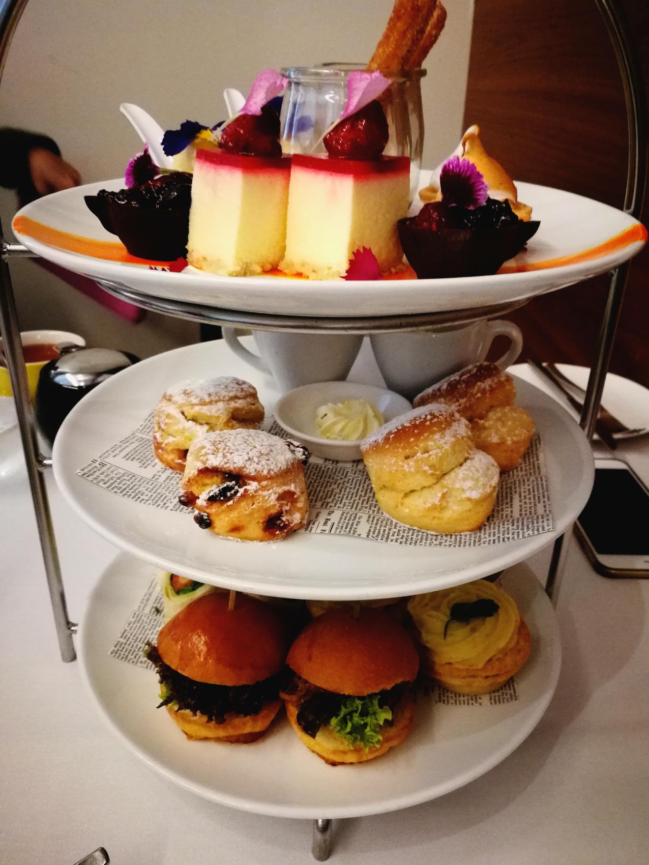 茶点按照菜单分类分成三层,按照传统,从最下面一层开始吃,包括鸡蛋青瓜三明治,肉酱派,三文鱼卷饼还有海鲜可丽饼。