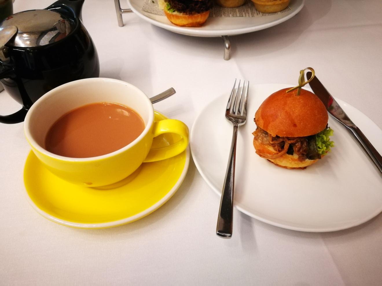 青瓜三明治非常爽口,是开始的最好选择,鸡蛋加了一点点的芥末,微微的刺激你的味蕾,mince pie味道不会太浓,而且也不会太腻,三文鱼卷饼里面配着火箭菜以及牛油果,口感丰富,味道清新自然,别忘记了烤猪肉小汉堡,很可爱,但是味道浓郁,用料新鲜,面包外香里嫩,生菜爽口清新,烤猪肉非常入味,配合起来简直是天人合一。