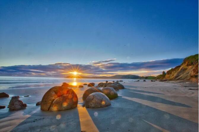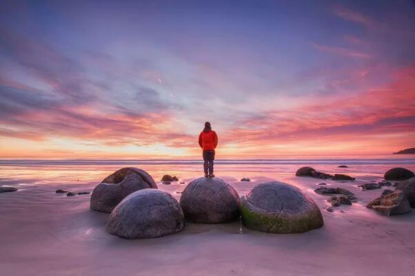有一个神奇的地方,位于距离奥玛鲁30公里处。退潮之时,沙滩上散布着许多巨大的圆石,每一块都重达数吨,高达两米。这些就是著名的摩拉基大圆石,到此一游的客人都会摆出不同的pose,与大圆石合影留念,你会选择什么样的造型呢?