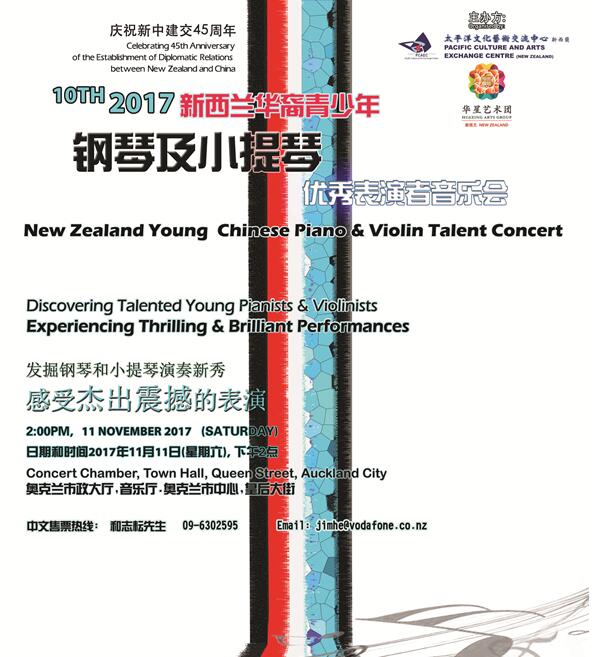 经过认真选拔,25名优秀钢琴选手和13名优秀小提琴选手将参加11月11日(周六)下午2:00假奥克兰市政大厅音乐厅举办的2017年(第十届)新西兰华裔青少年优秀钢琴,小提琴表演音乐会.小选手们将为大家演奏经典的中外名曲。