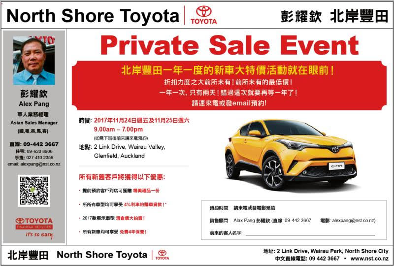 丰田汽车在北岸唯一一名华人销售经理Alex Pang(彭耀钦)表示,北岸丰田一直以来都受到华人客户朋友的支持,为了回顾广大新老客户,北岸丰田特别推出了新车大特价活动。
