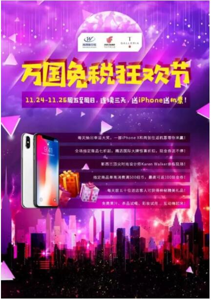 连续三天免税狂欢庆典,每天都有新惊喜!全场折扣享不停,更有机会获得超多超值礼物!抽奖活动每天进行,iPhone X手机,回国往返机票,等待幸运儿!