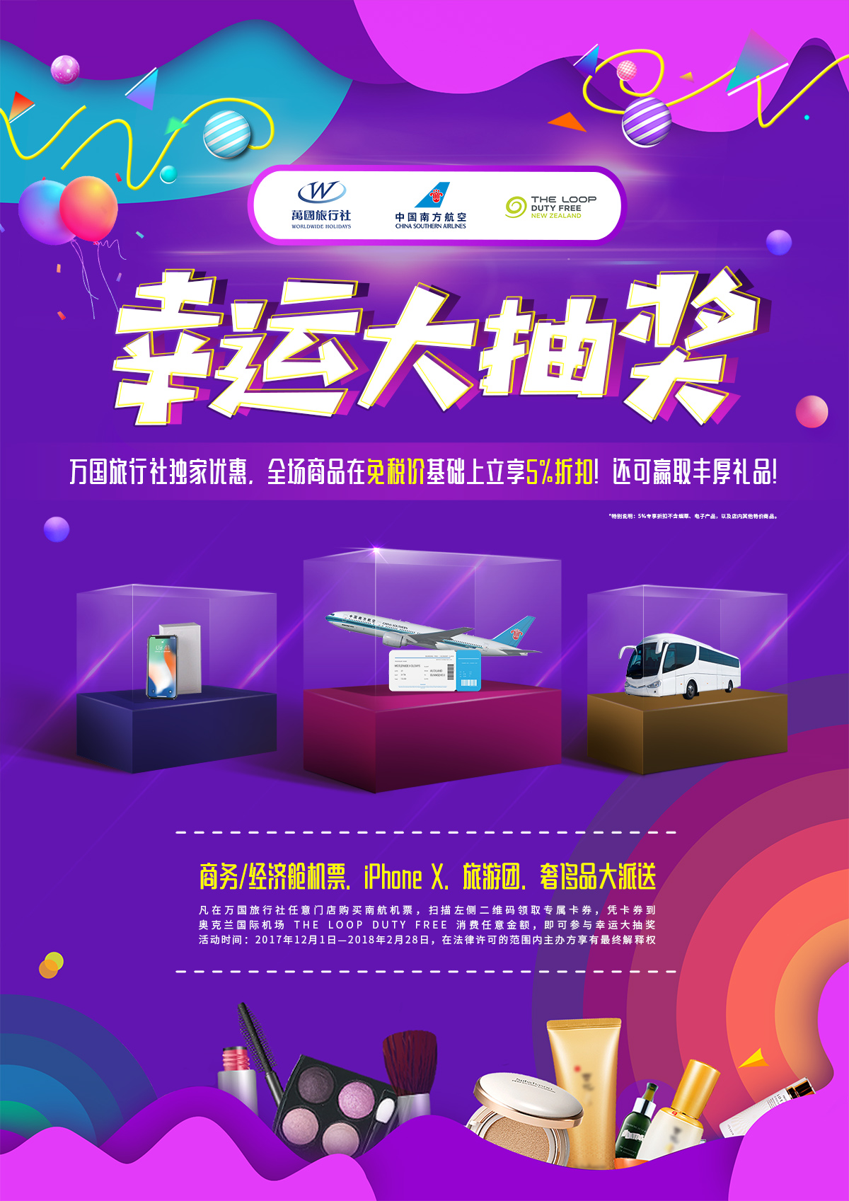 注意:持有万国旅行社出发的【南方航空机票】的客人,可赢取商务舱、经济舱往返机票,iPhone X,新西兰南北岛游,以及Dior、Lancome套装等超多超值精美礼品!