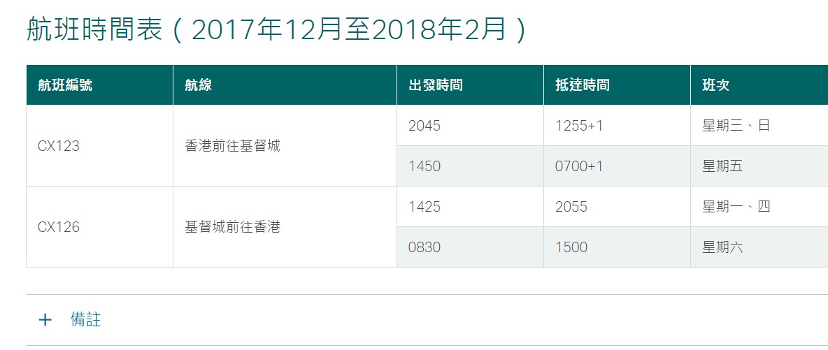 此番新开通的季节性航班每周3个班次,每周三、周五、周日由香港出发,将运营至2018年2月28日。配合国泰航空现有季节性每日两班往来奥克兰的服务、以及新西兰航空每日一班往来香港及奥克兰的服务,将为乘客带来更多选择,进一步拓展新西兰南岛和中国香港之间的贸易和旅游机遇。