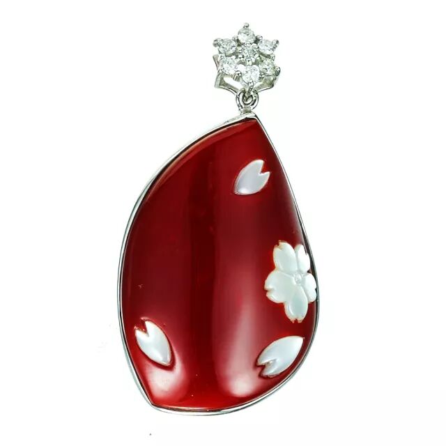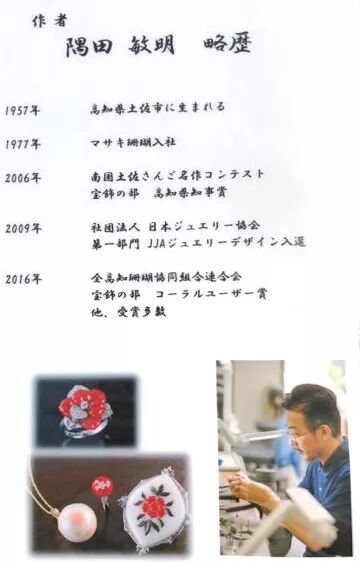 这一款是日本赤血阿卡,也就是最顶级最稀少的牛血里的最深色,这款的雕刻大师是隅田敏明,像这种在珊瑚上面,深挖雕孔,镶嵌恰好大小白贝母的技术,目前全世界就只有两位大师可以,他就是其中一个。