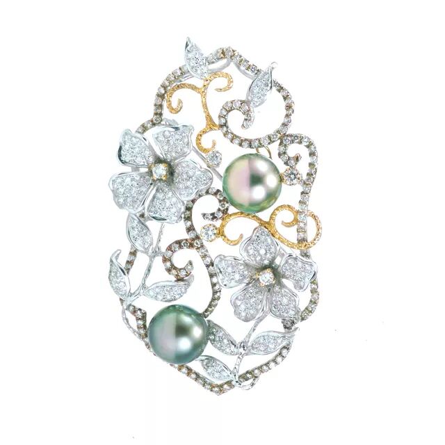 中国窗花的灵感,全日本精工,用18k三色金突出枝蔓,叶片,花瓣的层次感,镶嵌2.35ct白钻,9mm+大溪地孔雀绿和vivid green黑珍珠各一粒,胸针吊坠两用。