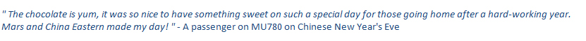 "The chocolate is yum, it was so nice to have something sweet on such a special day for those going home after a hard-working year. Mars and China Eastern made my day! "