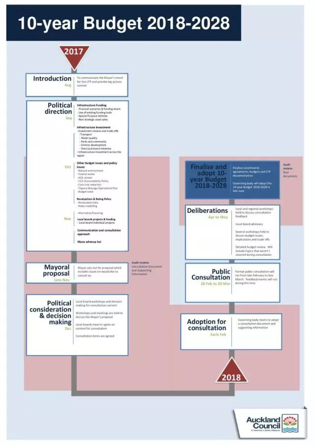 在市政府公布的所有议案中,与居民最为切身相关的,恐怕当属十年发展计划了(又称长期规划)。通常来说,这份计划案每3年修订一次——2017年12月,在为期三个月的区域和地方调查会议、城市现状和压力调查等工作之后,奥克兰市议会公布了全新市政府十年发展计划的修订意见。