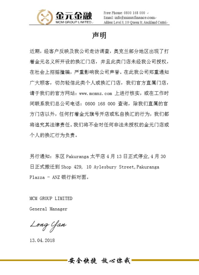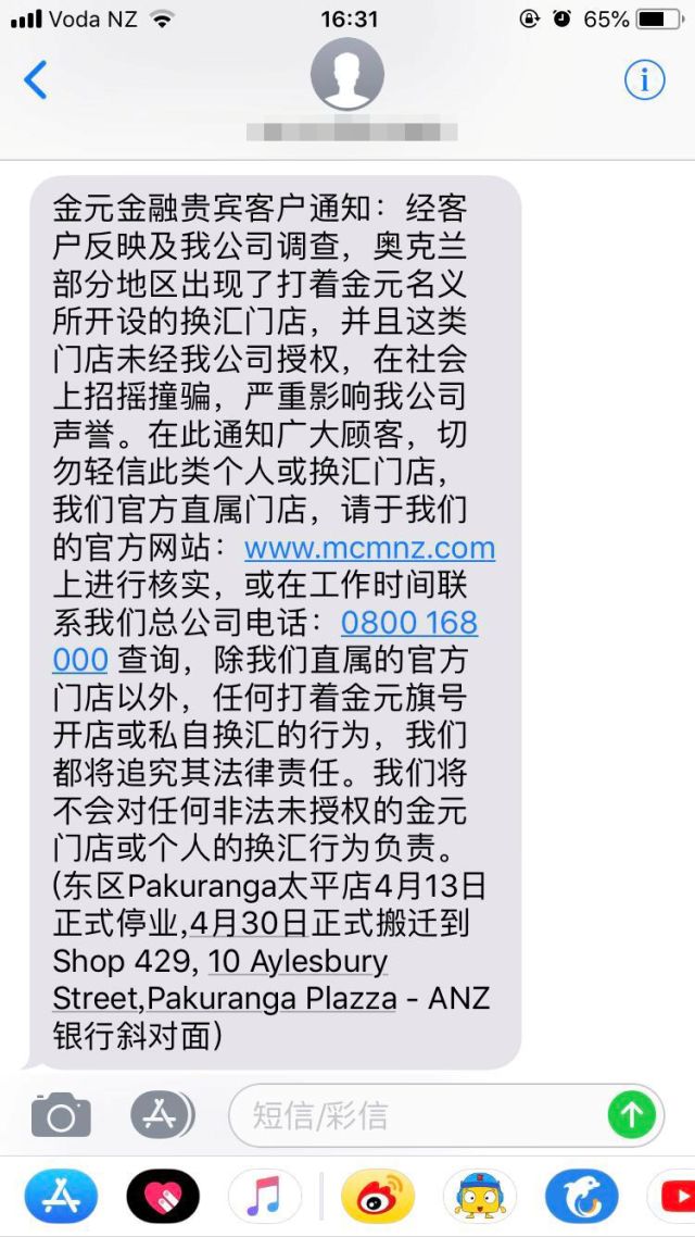 不要以为出了国骗子就会放过你,近日“假冒的知名换汇公司” 已使多名在新西兰生活的小伙伴上当受骗。诈骗手段尤为猖獗,甚至上到被害人家里收取纽币现金,收到后不主动出具任何换汇单据,即使最终被害人要到单据,也是模仿正规公司名称及金融持牌号的单据,真假难辨。 事件始末: 天维网记者采访了金元金融的总经理Dave,他表示公司在2周前获悉有人冒充金元金融销售人员,在新西兰各大生活资讯群里大量加人,声称可以提供换汇业务。目前已经有多人受骗。受害者最后向金元金融求证时才发现并无此员工。更有甚者,竟然直接打着金元公司的名义,开店招揽顾客。 “几天前,我们公司的客服人员接到一通客户的来电,客户在电话里抱怨说之前找我们公司换汇,到现在还没有收到汇款,究竟怎么回事。当时我们的客服人员就觉得很诧异,我们公司的换汇流程一向专业快速,从未出现过换汇资金多天无法到账的情况。并且每一笔的换汇交易都会有正规收据给客户。于是在电话中我们的客服人员尽可能的安抚客户情绪,并询问客户的收据信息,因为情节比较诡异,金元金融相关负责人立刻开始在公司系统里查询究竟哪一个环节出现了问题并且由经理直接出面及时与该客户沟通。 客户将收据截图发给客服后,发现被骗人所提供的收据上面虽然显示的是金元金融的英文法定名称,但是收据格式与正规的格式完全不同。当时我们就意识到可能有不法分子冒充了我们公司的名义对我们公司的客户进行欺诈” 上图为被骗人所提供的假收据 上图为金元金融所提供的正规收据示例 冒名顶替,抹黑正牌公司 金元金融相关负责人立即向受害人了解当时具体情况,并结合公司方面的调查发现:金元金融近几年发展迅速,在不同地区开设多家分店。原本位于东区Pakuranga太平超市内的门店由于发展需要搬迁至Shop 429, 10 Aylesbury Street,Pakuranga Plazza(ANZ银行对面),原计划4月30日正式营业。但原本的租位立刻被另一家换汇公司续租。更离谱的是这家换汇公司对外宣称的中文名称与已搬迁的金元金融名称基本相同。不知道金元金融公司已搬迁的客户依然至原地址进行换汇交易。记者还了解到,每一家正规的金融公司都必须持有政府颁发的金融持牌证书(号),然而这家与其同名的换汇公司没有任何的持牌信息,导致许多客户被蒙在鼓里。 被害人提供的冒充金元金融销售人员微信: 从提供的信息来看,被害人在交易过程中还是相对比较谨慎的,有索要收据。但是无奈骗子以下班为由敷衍了过去。 骗子不停已各种理由搪塞被害人,使被害人逐渐意识到可能是被骗了。 在换汇后对应款项迟迟没有到账,客户致电了金元总店客服询问,才知“此金元非彼金元”。这种抹黑正规公司的行为不仅给大量客户造成严重的资金损失,同时也对金元金融造成了严重的名誉危害。 迅速应对,保障客户利益 天维网记者采访金元金融的总经理Dave了解到, 介于此次的事件对多方面带来的恶劣影响,金元金融立即作出应对补救措施来防止更多的客户受骗。 金元金融客户系统已发短信至每一位注册客户告知情况,谨防受骗 在各大门店及平台发出正式声明 金元金融已联系律师团队追究冒牌公司的法律责任。 金元金融在此温馨提示每一位有业务需求的小伙伴们: 根据新西兰反洗钱法案规定及各公司资金吞吐的能力,金额在1000纽币以下的换汇行为可以在公司门店无需注册即可进行,而超过1000纽币的换汇额度,则必须本人到金融公司或其下属门店填写开户表格,并提供对应的个人信息。不管是在门店还是通过其他方式换汇,切记索要收据来保障自己的权益。在此也特别提醒大家不要相信任何以超出合理范围的汇率吸引客户的低级骗局,请一定要到正规的换汇公司做相关的交易。 金元金融成立于新西兰奥克兰,是一家专业的外汇及金融服务公司。拥有经验丰富的专业团队为客户提供高效的个人金融服务。 主要业务包括货币交易及兑换,Forextrade金盾在线自助换汇平台,支付宝及微信钱包服务,各类保险业务,翻译业务以及信贷服务类业务。 公司始终秉承信誉至上的经营理念,为客户提供多元化的金融服务。安全,专业,高效是金元金融一向的服务宗旨。 特别声明: 除金元金融直属的官方门店以外,任何打着金元旗号开店或私自换汇的行为,金元金融将追究其法律责任。我们将不会对任何非法未授权的金元门店或个人的换汇行为负责。 以下为金元金融所属门店信息: 总公司地址: Level 8, 109 Queen street, Auckland CBD联系方式: 0800 168 000 旗舰体验店: Shop2/Tai Ping Supermarket, 911 Dominion Road Auckland联系方式: (09)5339666 北岸Albany分店:100 Donmckinnon Drive, Albany Auckland 联系方式:(09)4146668 北岸Northcote分店:53 Pearn Cresent, Northcote, Auckland 联系方式:(09)4192666 中区New Market分店:3 Kent Street, New Market, Auckland 联系方式:(09)6660674 西区New Lynn分店:3053 Great North Road, New Lynn, Auckland 联系方式:(09)8275388 中区Dominion Road分店:83 Dominion Rd, Mount Eden, Auckland 联系方式:(09)6310800 东区Pakuranga分店:Shop 429, 10 Aylesbury Street,Pakuranga Plazza, Auckland 联系方式:(09)5760968 (ANZ银行对面,装修中...4月30日正式营业) 金元金融官方微信客服 最后!小编提醒各位小伙伴!千万要擦亮眼睛,谨防上当受骗!!! *以上内容皆由金元金融提供