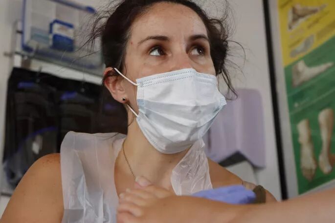 陶朗加一家诊所的医生在接待病人时戴上了口罩